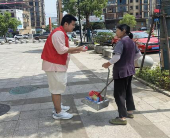 随后,在社区党委成员的带领下,志愿者们开展了社区劳动服务活动。志愿者们带着扫帚、簸箕等工具在社区道路上清理垃圾杂物,对道路两旁、灌木丛中的垃圾进行了细致的清理。经过志愿者们的辛苦清扫,有效改善了社区的环境卫生。志愿者们还为烈日下辛苦清扫的阿姨、时刻守护社区安全的门卫大叔等社区工作者们送去甘甜的水,让他们能够在炎炎夏日里多一丝清凉。