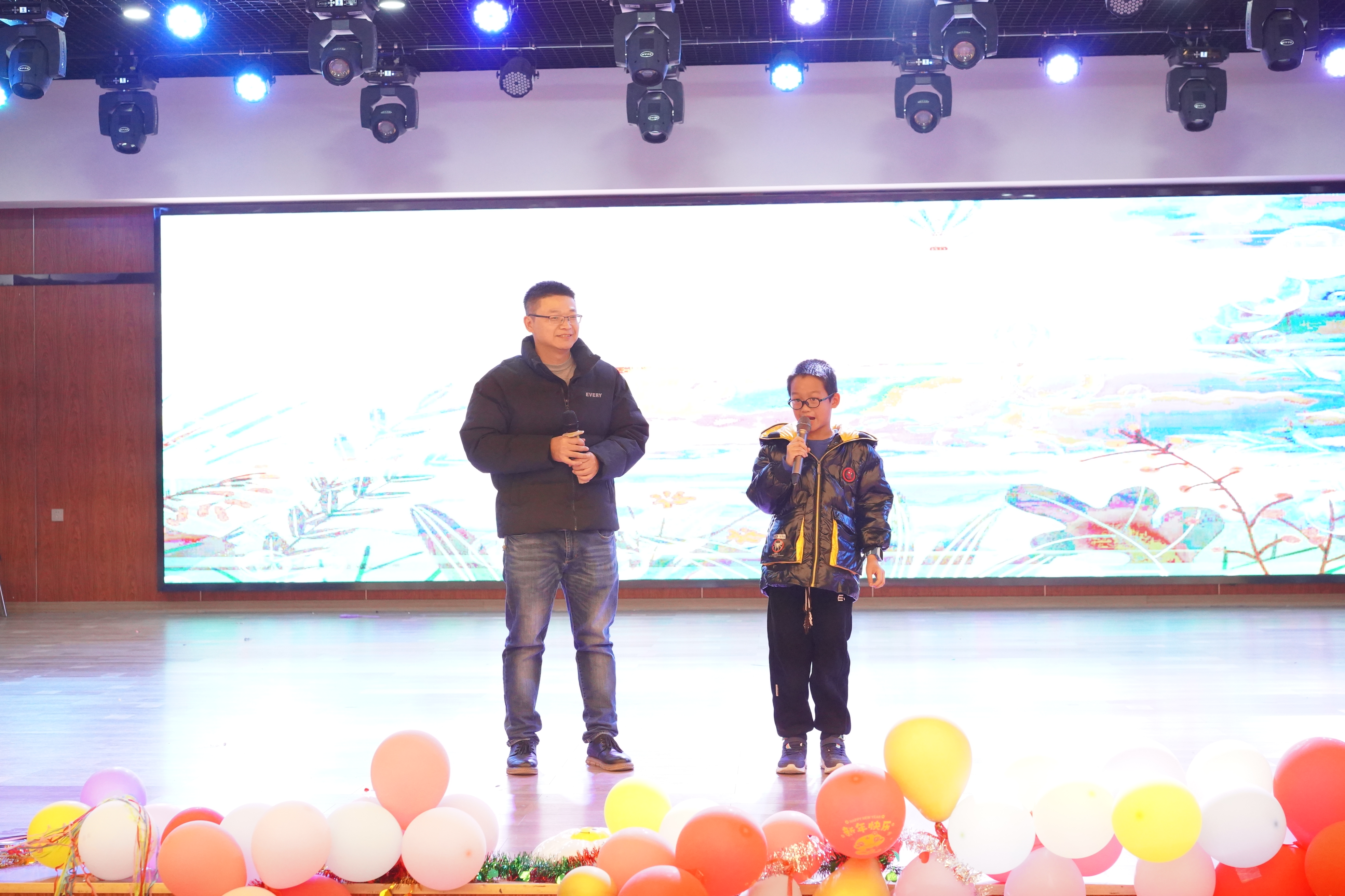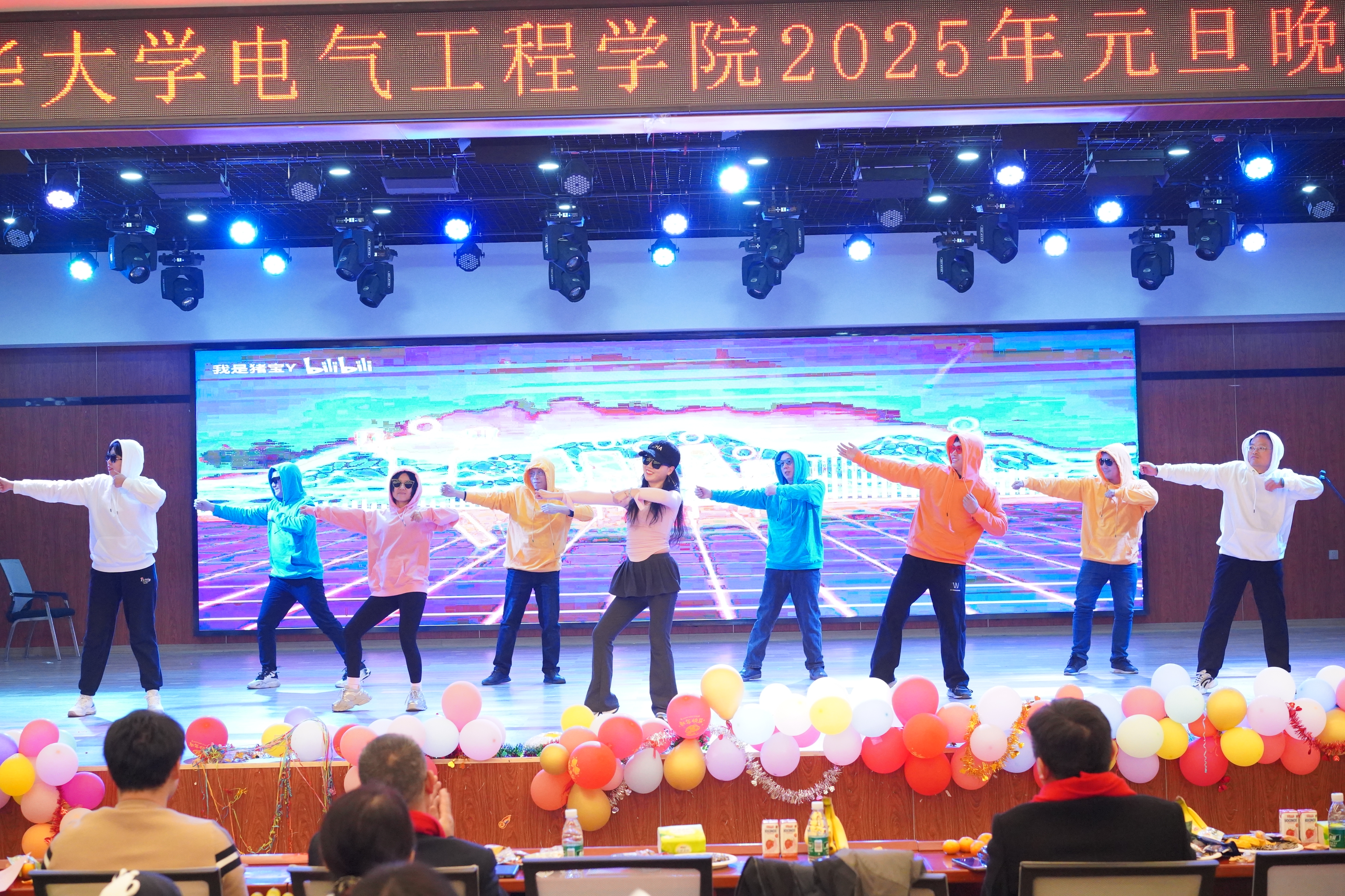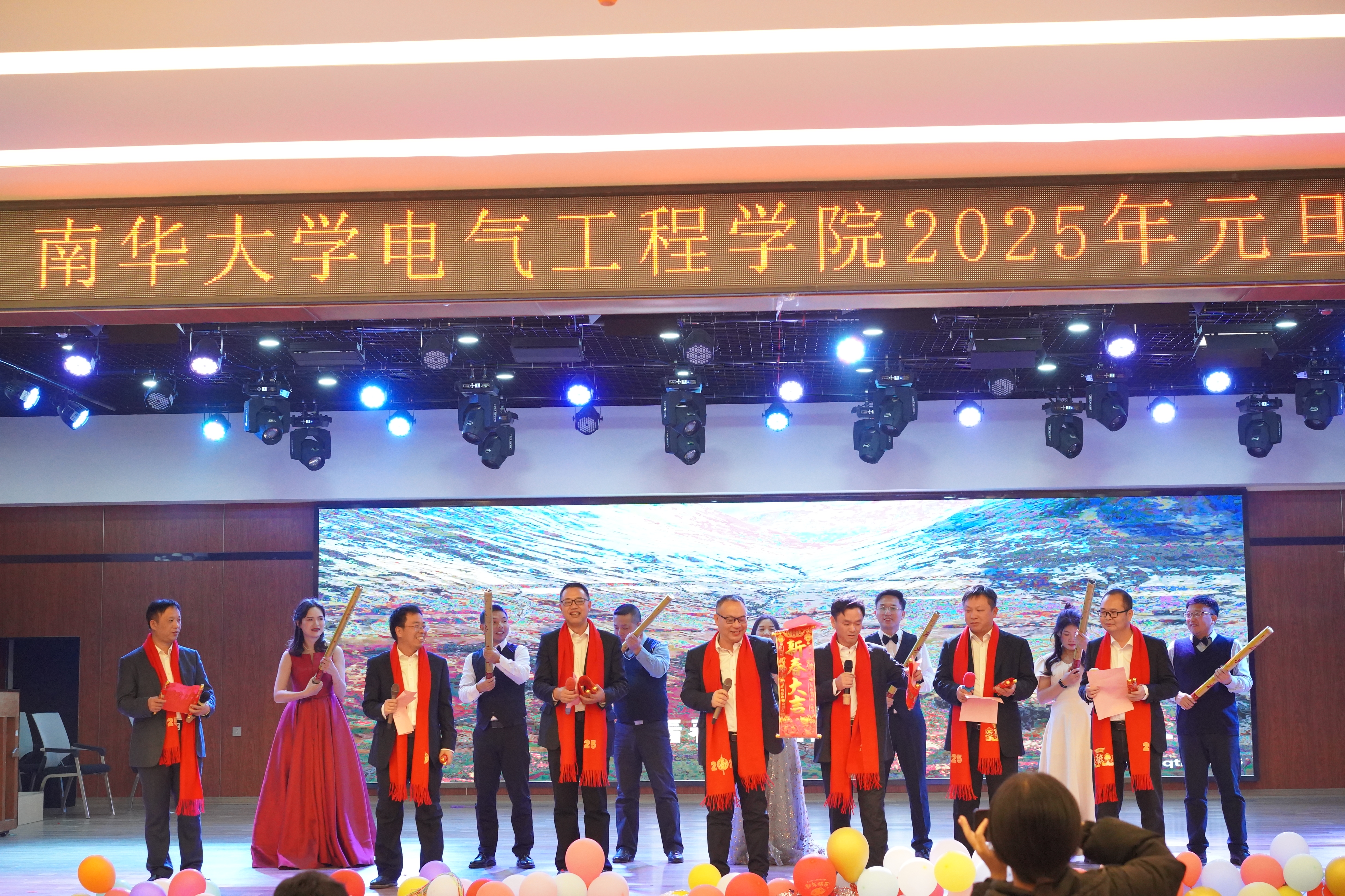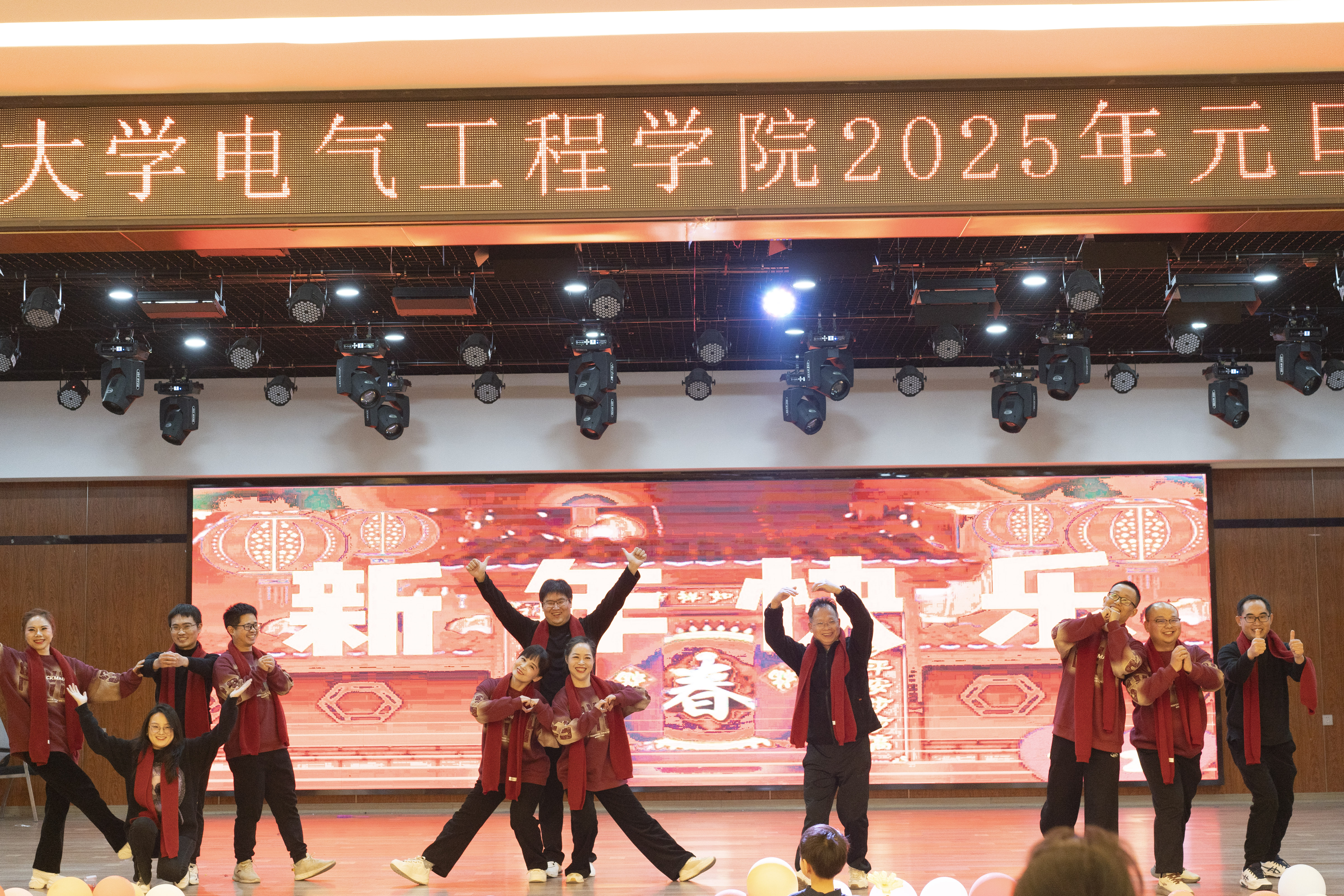 晚会在电工电子教学中心老师们表演的舞蹈《过年啦》拉开序幕,欢快的节奏、喜庆的服装和灵动的舞姿瞬间点燃了现场的气氛。由生物医学工程系老师们合唱的《新年钟声响起来》,歌声饱含对2025年的美好期盼和深深祝福。由院办、学工室、教务办老师们表演的《手扶拖拉机司机》,独特的创意和精彩的表演让现场欢声不断。由电子信息工程系欧阳宏志老师带来的亲子合唱《离别开出花儿》,歌声婉转,传递着浓浓的温暖与美好。由新入职教师代表赵洪泉老师和杨健老师带来的联唱《心的祈祷》、《曹操》,展现了新入职教师的多才多艺和青春活力。由通信工程系老师们表演的集体舞《可爱摆》,多彩的服饰搭配俏皮的舞姿让现场充满了欢声笑语。由电工电子教学中心刘原老师表演的越剧《胭脂。慎思》,优美的唱腔和精湛的表演让大家领略了传统越剧的独特魅力。由电气工程系曾铁军老师女儿曾馨晨表演的舞蹈《小当家》,童真的舞姿赢得掌声不断。由机器人工程系和自动化系王超老师和谢富强老师的孩子谢博安和王一诺表演的架子鼓《Butter-Fly》,激昂的鼓点和动感的节奏让现场观众热血沸腾。在欢送离退休教师和抽奖环节,现场更是气氛高涨,掌声不断。在晚会的尾声,由全体院领导和学工老师们联唱的《小美满》、《真心英雄》、《明天会更好》,深情的歌声传递着对全体教职工的美好祝福和对学院未来发展的坚定信心。
