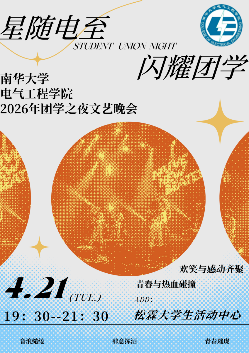 我们在此以电之名,诚挚邀约,与你共赴这场专属于电气学子的流光盛宴,一同接通星光,共燃滚烫年华!
