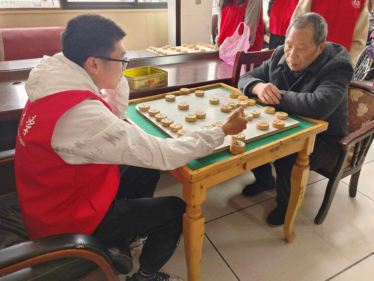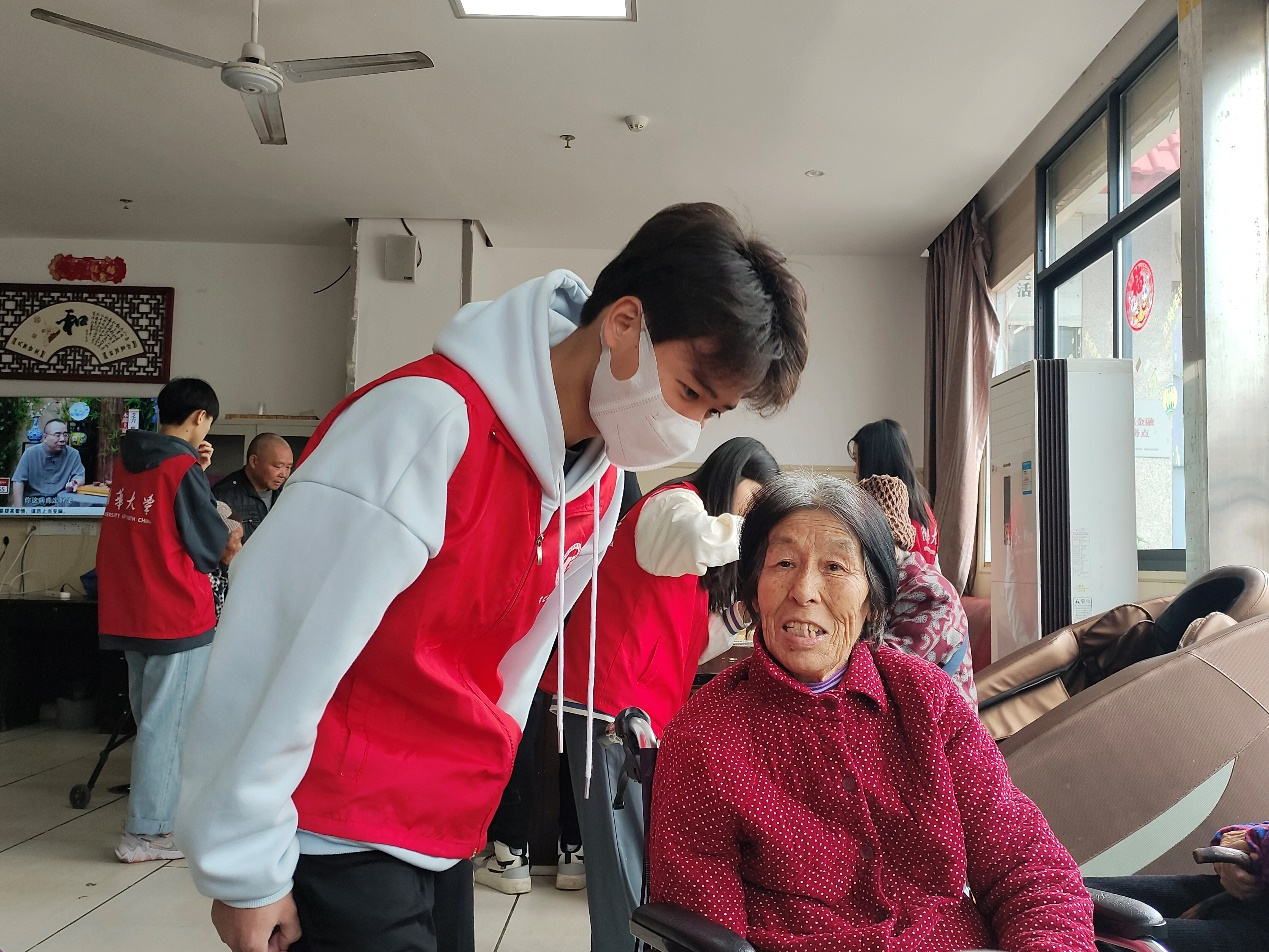 走进敬老院,志愿者们受到老人们热情的欢迎,看着老人们脸上洋溢着温暖的笑容,让志愿者们服务的热情愈加高涨。大学生们在工作人员的带领下,分小组去慰问老人。志愿者们来到老人身边,热切地与老人交谈,陪伴老人。他们有些人俯身于老人身旁,认真地为老人修剪指甲;有些人陪伴老人下象棋,过程中欢声笑语不断;有些人认真地清理房屋垃圾和污水,为老人们打造出了温暖舒适的家。老人们看见志愿者们忙碌的身影,不由露出慈爱的笑容,向志愿者们表达着感谢。