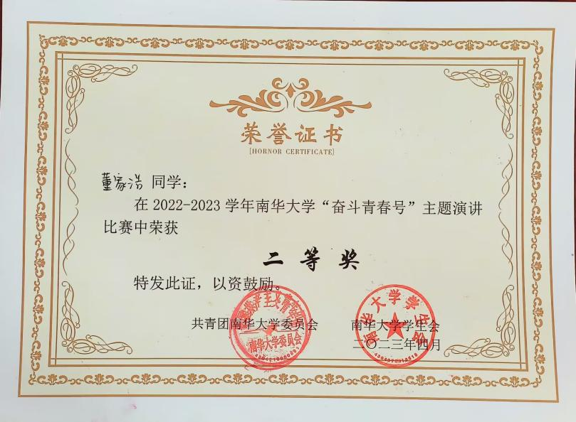 为深入学习贯彻习近平新时代中国特色社会主义思想,全面贯彻落实党的二十大精神,2023年4月,共青团PA视讯平台委员会和南华大学学生会联合举办“奋斗青春号”演讲比赛。决赛中,PA视讯平台参赛选手董家浩同学表现优异,从比赛中脱颖而出,最终荣获二等奖。在此向董家浩同学表示热烈的祝贺!