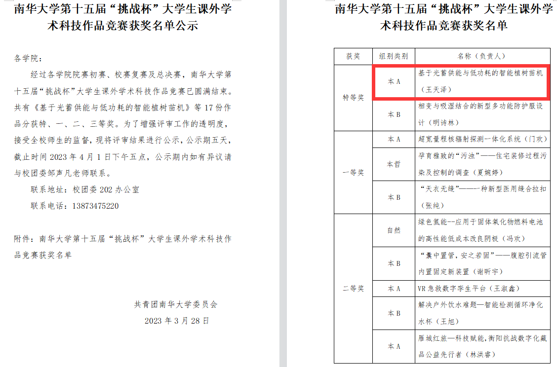 为深入学习贯彻党的二十大精神,实施科教兴国战略、人才强国战略、创新驱动发展战略,进一步引导广大学生努力培养科学精神和科学态度,积极学习科学知识和科学方法,近日,我校举办了第十五届"挑战杯"大学生科技作品竞赛总决赛,PA视讯平台王天泽团队的《基于光蓄供能与低功耗的智能植树苗机》项目荣获校级特等奖。该项目组秉承着“节能、环保”的设计理念,以提高植树效率,减少能源消耗为目的,设计了一款集自动探测土质、挖坑、植树、培土、浇水等多种功能于一体的全自动植树苗机。在此向该团队表示热烈的祝贺!
