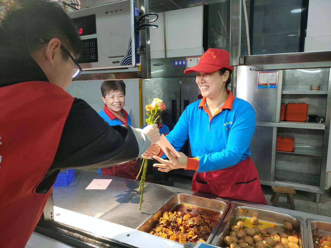 志愿队伍准备了100份贺卡和100枝鲜花,活动前日,志愿者们认真地书写贺卡和修剪鲜花,用一枝枝芳香怡人的花朵和一张张精美的贺卡来表达对劳动者们深深的祝福与感恩。活动中,在食堂、宿舍、街道等每一个有劳动者的地方,就有红色的身影穿梭人群,为食堂阿姨、保安叔叔、宿管大姐们献上美好祝福的贺卡和鲜花。“您辛苦了,祝您劳动节快乐!”在志愿者们的温情慰问下,叔叔阿姨们的惊喜之情溢于言表,每个人脸上都洋溢着幸福的微笑。食堂阿姨收到鲜花后很是欣喜,她说:“每天为同学们打上美味的饭菜是我的职责,今天收到同学们的祝福和鲜花,我也觉得很幸福!”
