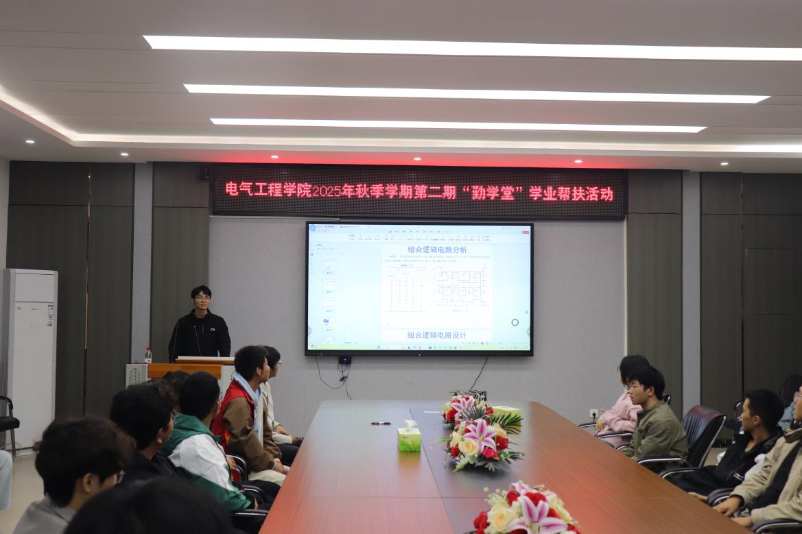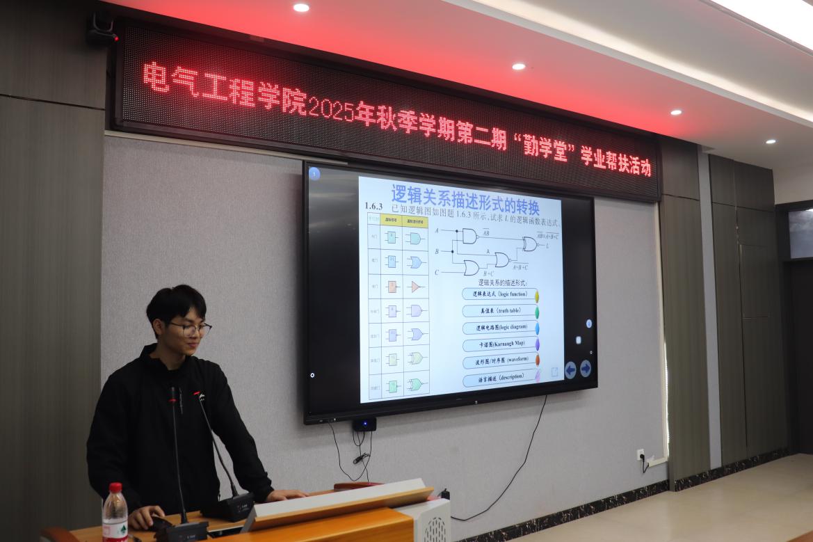 10月30日,PA视讯平台,PA视讯,PA视讯官网于崇业楼B301会议室成功举办2025年秋季学期第二期“勤学堂”学业帮扶活动。本期活动聚焦“数字电子技术”课程,特邀国家奖学金获得者刘俭厚同学担任主讲,为在场同学带来一场内容翔实、精彩纷呈的学业辅导。