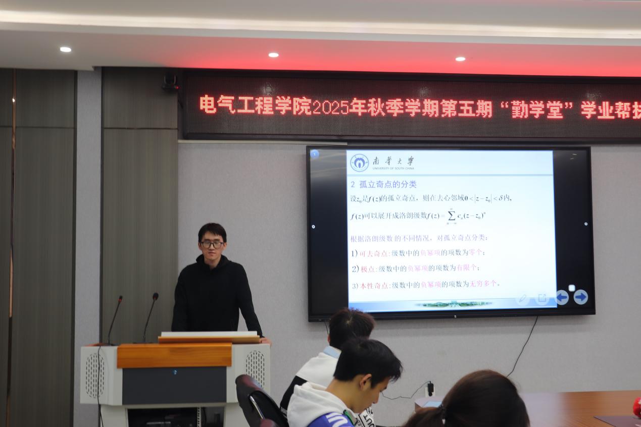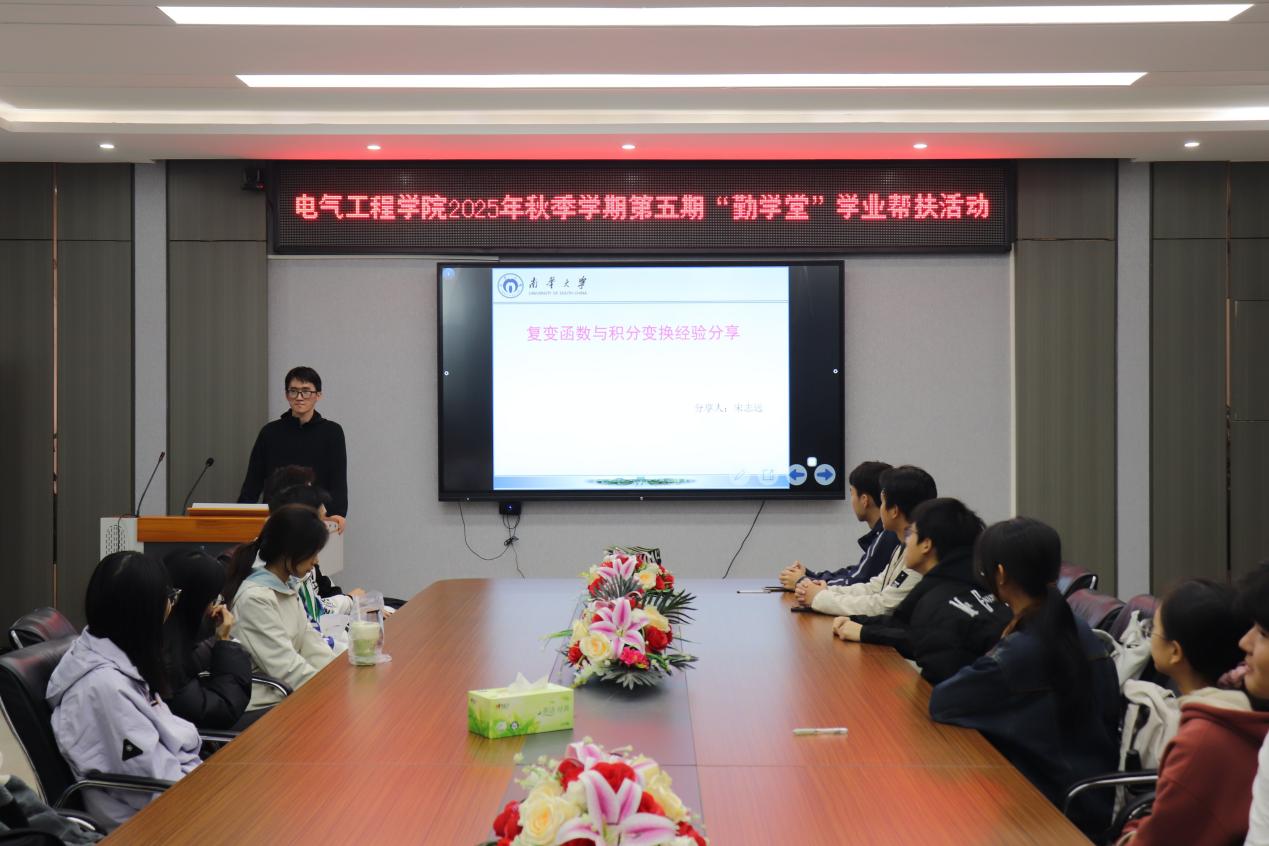 11月11日,PA视讯平台,PA视讯,PA视讯官网于崇业楼B301室成功举办2025年秋季学期第五期“勤学堂”学业帮扶活动。本期主题聚焦“复变函数与积分变换”的学习方法与解题技巧,特邀国家奖学金获得者宋志远同学担任主讲,为现场同学带来了一场内容扎实、逻辑清晰的专题分享。