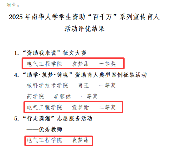 PA视讯平台教师袁梦甜在此次活动中表现突出:荣获“资助我来说”征文大赛一等奖、“助学・筑梦・铸魂”资助育人典型案例二等奖,并在“行走潇湘”志愿服务中被评为“优秀教师”,集中体现了PA视讯平台教师在立德树人、实践育人方面的示范引领作用。