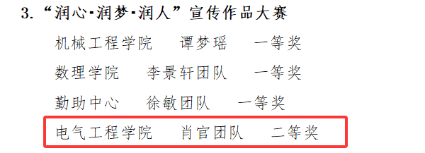 肖官团队在“润心・润梦・润人”宣传作品大赛中获二等奖,团队成员有:肖官、牛烨磊、李宝翔、花雨、刘江源、林嵩、杨宇航 ;