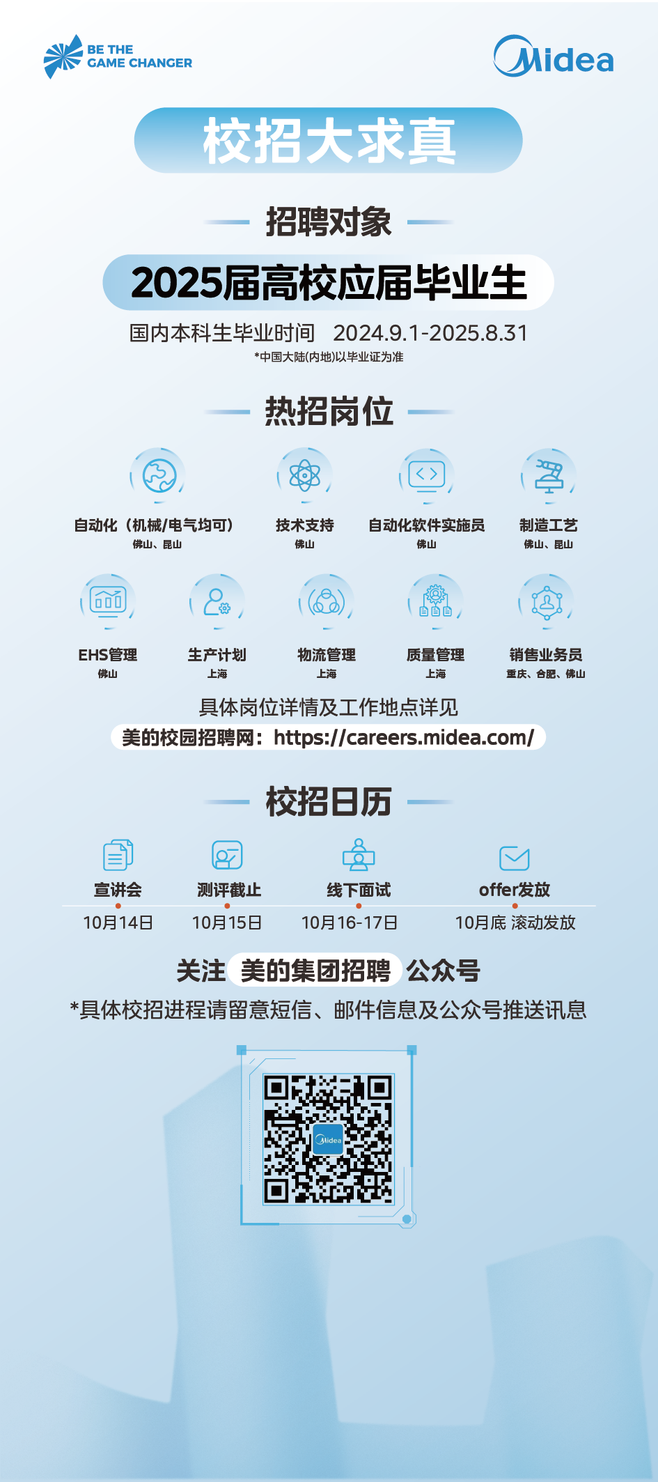 #美的集团校招-PA视讯平台宣讲会📣📣⏱10月14日(周一)15:00-16:30📍雨母校区-松霖大学生活动中心就业多功能厅😎校友倾情分享,现场福利送不停!👇🏻查看热招岗位,等你来投递!🔍扫码进微信群,离offer更近一步❗️报名网址:https://jiuye.usc.edu.cn/teachin/view/id/112113