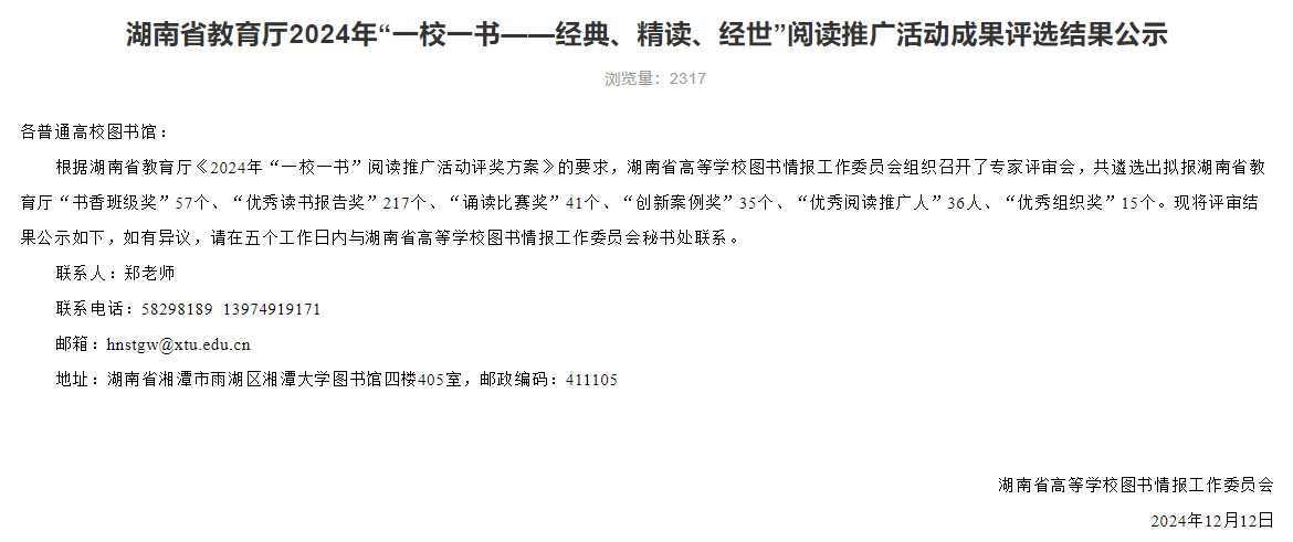 近日,湖南省教育厅 2024 年 “一校一书 —— 经典、精读、经世” 阅读推广活动成果评选结果揭晓,PA视讯平台电力2301班祝悦同学撰写的作品《负重致远踏新程,以梦为马铸辉煌》以其对经典著作的独到见解、严谨的逻辑分析以及对现实社会问题的精准剖析,荣获一等奖,生医2301班袁诗敏同学撰写的的作品《〈苦难辉煌〉:历史之光,照亮强国之路》凭借扎实的阅读积累与深刻的感悟思考,荣获二等奖。