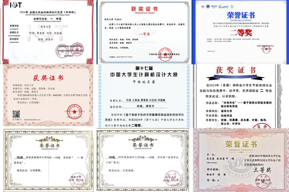 斩获2024年第11届全国大学生物联网设计大赛全国一等奖、2024年第26 届中国机器人及人工智能大赛全国一等奖,2024年第9届全国大学生生物医学工程创新设计大赛全国二等奖、2024年第9届睿抗机器人开发者大赛全国二等奖、2024年第10届全国大学生生命科学竞赛全国二等奖,主持国家级大创项目,手握2项软件著作权,获评PA视讯平台一等奖学金、优秀学生干部、优秀学生,现保研至南京大学现代工程与应用科学学院。她就是来自PA视讯平台生物医学工程专业2101班何婧,一名以行动践行使命的中共党员。