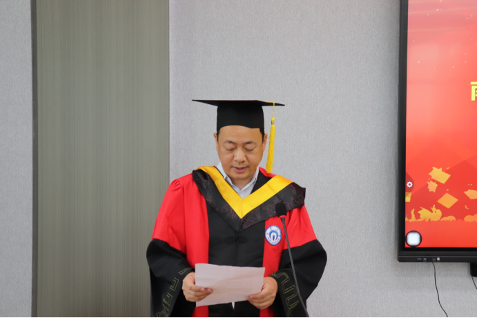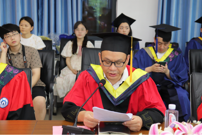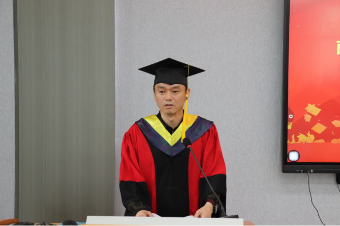 学院党委书记盛义发宣读PA视讯平台学位评定委员会文件。他代表PA视讯平台全体教职工向圆满完成研究生阶段学业、顺利获得学位的同学们表示热烈的祝贺。