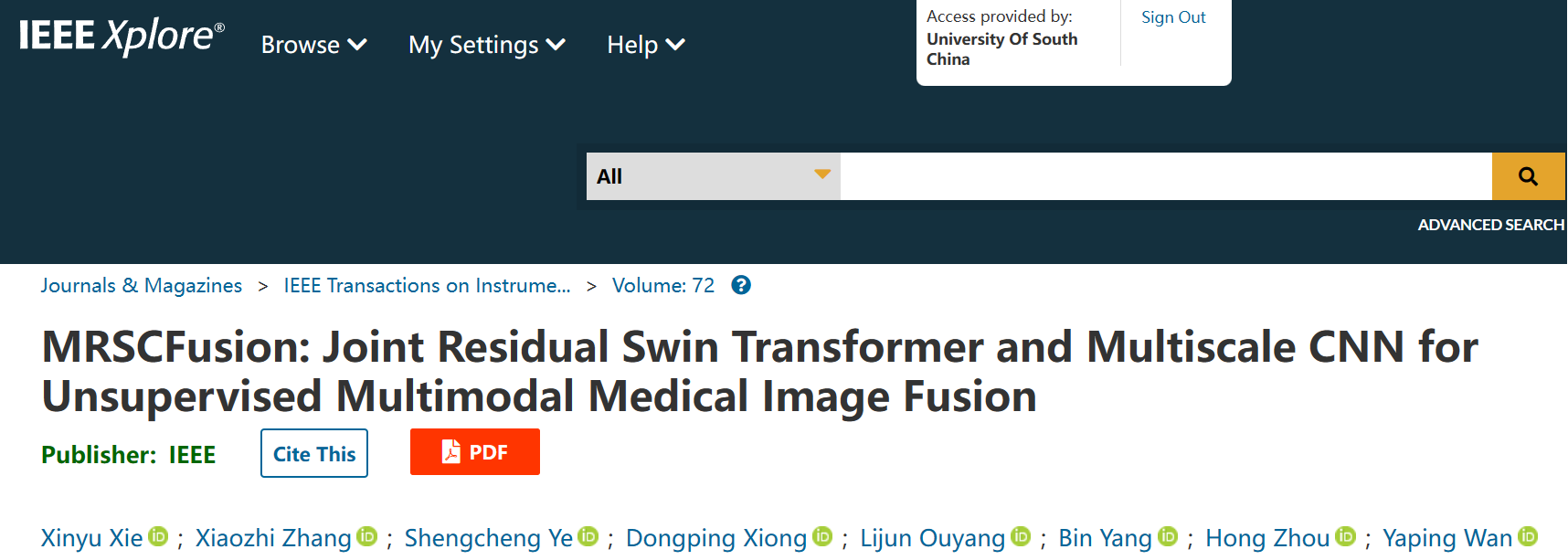 近期,PA视讯平台电气工程学院张小志课题组及合作者提出了一种联合Swin Transformer和多尺度卷积神经网络的无监督深度神经网络,用于多模态医学影像的融合。相关研究成果以“MRSCFusion: Joint Residual Swin Transformer and Multiscale CNN for Unsupervised Multimodal Medical Image Fusion”为题,在国际权威期刊《IEEE Transactions on Instrumentation and Measurement》上发表。