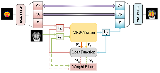 此外,为进一步有效地保留医学影像的纹理特征和强度信息,定义了包含内容损失和强度损失的联合损失函数来约束融合模块,并引入自适应权重来控制源图像的信息保留程度。所提出的框架在CT-MRI、PET-MRI和SPECT-MRI等多个融合任务上进行实验,通过定性和定量分析验证了模型的优越性。
