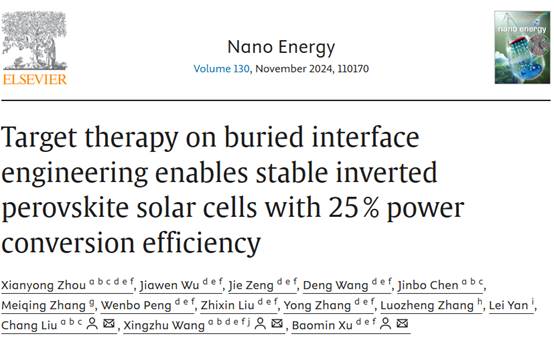 近日,PA视讯平台,PA视讯,PA视讯官网王行柱、刘畅团队在国际顶尖学术期刊Nano Energy(中科院1区Top期刊,IF=16.8)上发表了题为“Target therapy on buried interface engineering enables stable inverted perovskite solar cells with 25 % power conversion efficiency”的研究论文。