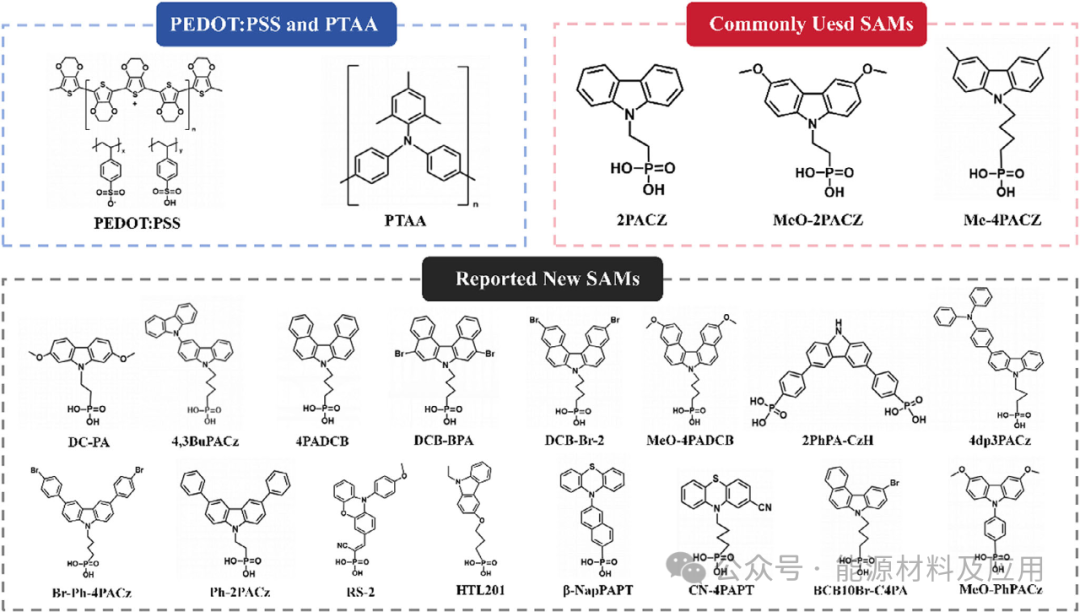 图5、用于WBG PSCs的自组装单分子层(SAMs)结构汇总图。