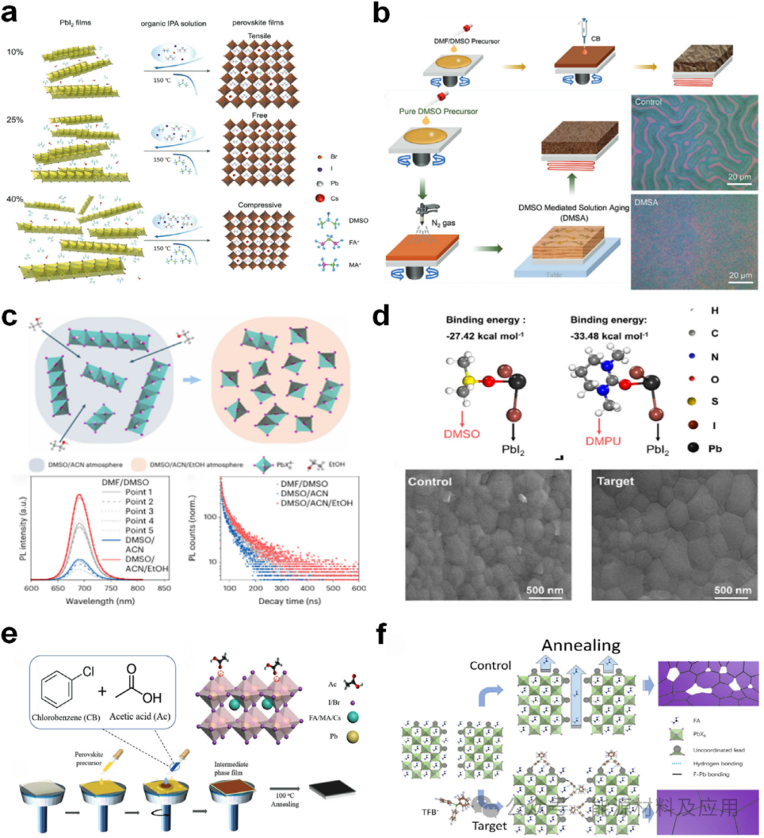 图11、a) DMSO诱导晶格应变机制图;b) DMSA无反溶剂工艺对比图;c) 乙醇改性前驱液的PL与TRPL对比;d) DMPU与DMSO对结晶行为的影响;e) 乙酸辅助结晶与缺陷钝化机制;f) KTFB调控晶界生长机制图。