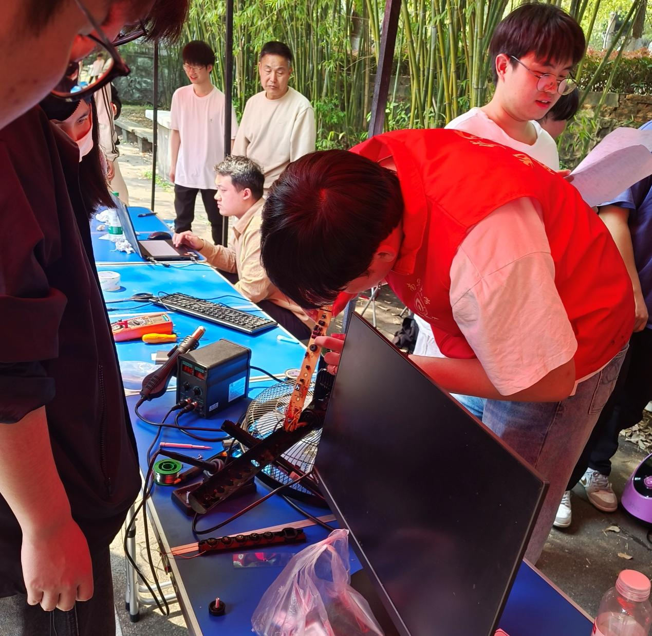 服务升级,贴心覆盖更多需求。今年活动新增“PC电脑维护”项目,成为一大亮点。不少师生带着卡顿的笔记本电脑前来求助,志愿者不仅免费清灰、重装系统,还耐心讲解日常维护技巧。此外,安全用电宣传台前,老党员们结合案例,向师生科普家电使用注意事项,生动实用的讲解吸引众人驻足聆听。“登记带回”服务,难题不留遗憾。对于无法现场修复的电器,志愿服务组详细登记信息,承诺后续跟进。张同学的电暖器因配件短缺暂未修好,但志愿者主动添加微信告知进度:“修好后第一时间通知您!”这种负责态度让师生倍感安心。