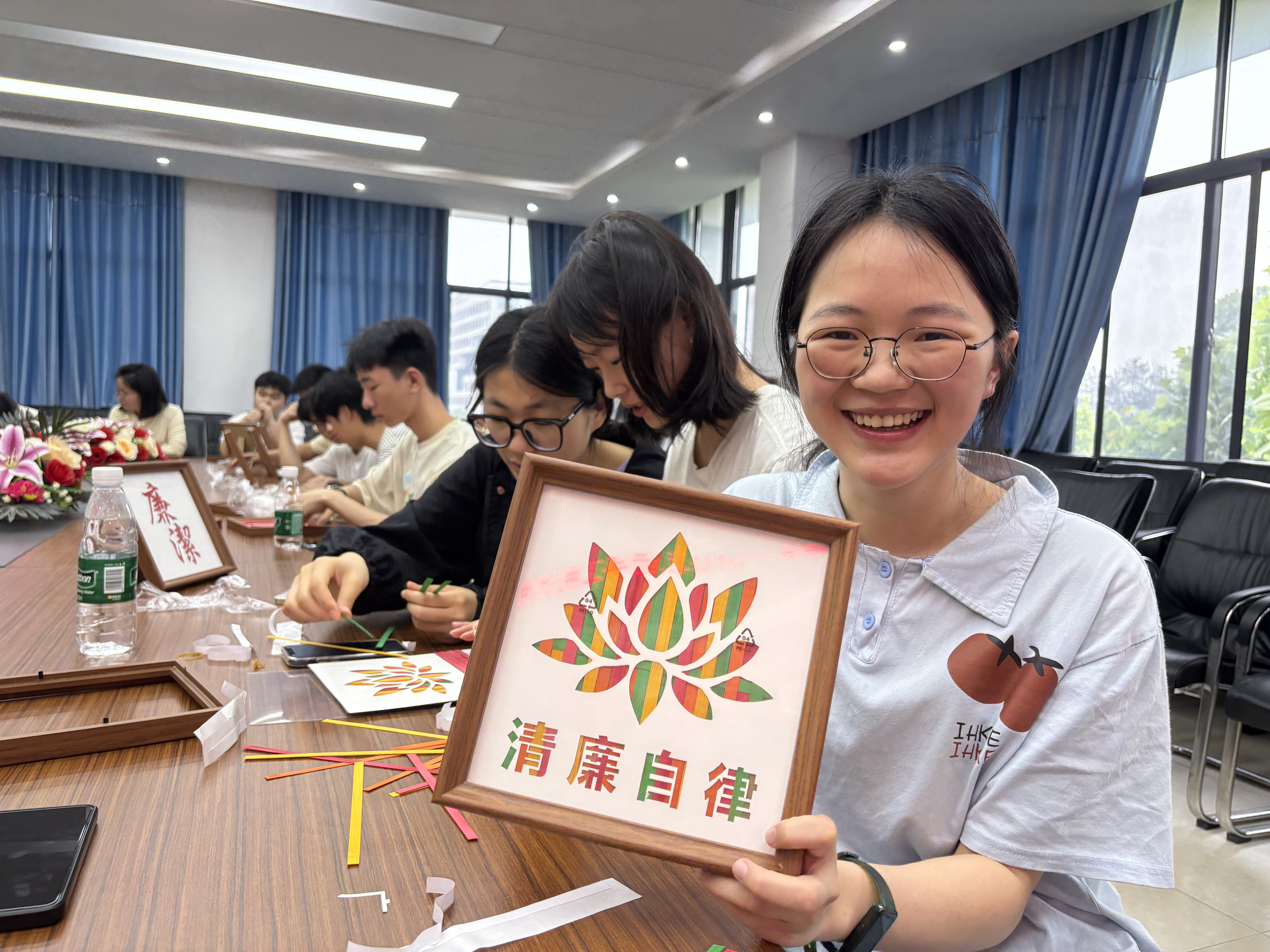 5月7日,学院20余名师生齐聚一堂,以竹为媒开展廉政文化创作。活动现场,竹篾翻飞间,师生们通过经纬编织技法,将象征清正廉洁的莲花、翠竹等图案定格在竹编画框之中。从选材时精选挺拔的竹节,到编织时经纬分明的交错,再到装裱时方正规整的收边,每个步骤都如同修身立德的过程——正如竹子‘虚心抱节’的特质,唯有严谨自律,方能成就清正品格。